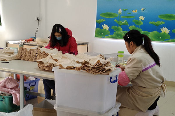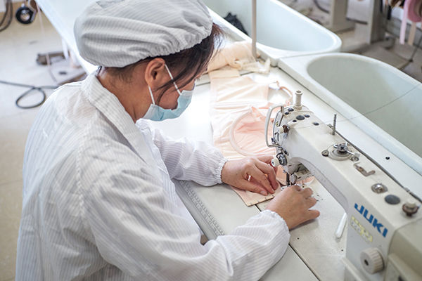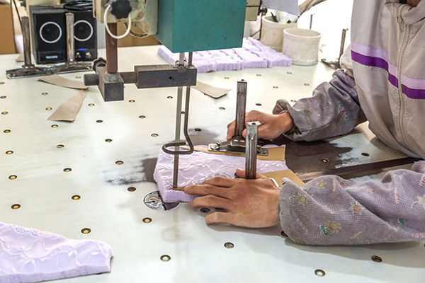 At this time we using double needle flat sewing machine to add cloth or other decorations.The second workstage need to stitch by the side. Remember to grab the cloth about 10cm with both hands during the sewing process, and pull it to the limit without breaking the thread, otherwise it will affect the wearing effect.